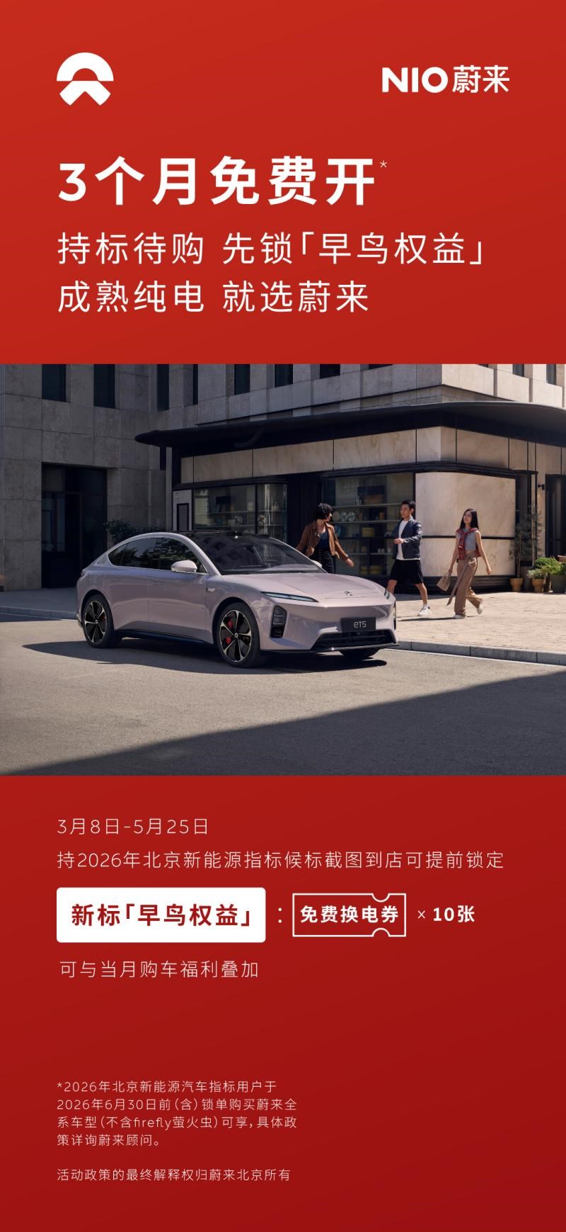 为进一步回应市场需求,蔚来北京推出了针对2026年北京新能源指标用户的专属“早鸟权益”。2026年3月8日至5月25日期间,持2026年北京新能源指标候标截图到店,即可提前锁定10张免费换电券*。该权益可与当月购车优惠叠加使用。同时,3月内锁单全新ES8的用户,还可享受限时专属好礼。对于持标用户而言,眼下正是锁单购车的关键时期。目前,蔚来北京门店已同步开启线下接待与体验服务。
