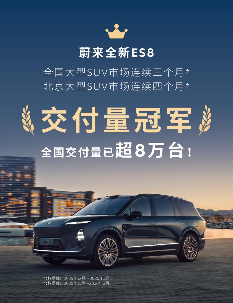 在大型SUV市场,蔚来全新ES8正以持续领先的销量成绩,成为热门之选。数据显示,自去年12月起,全新ES8已连续3个月位列全国大型SUV销量榜首。即便在2月传统销售淡季,其销量达到11,260台,展现出强劲的市场韧性。